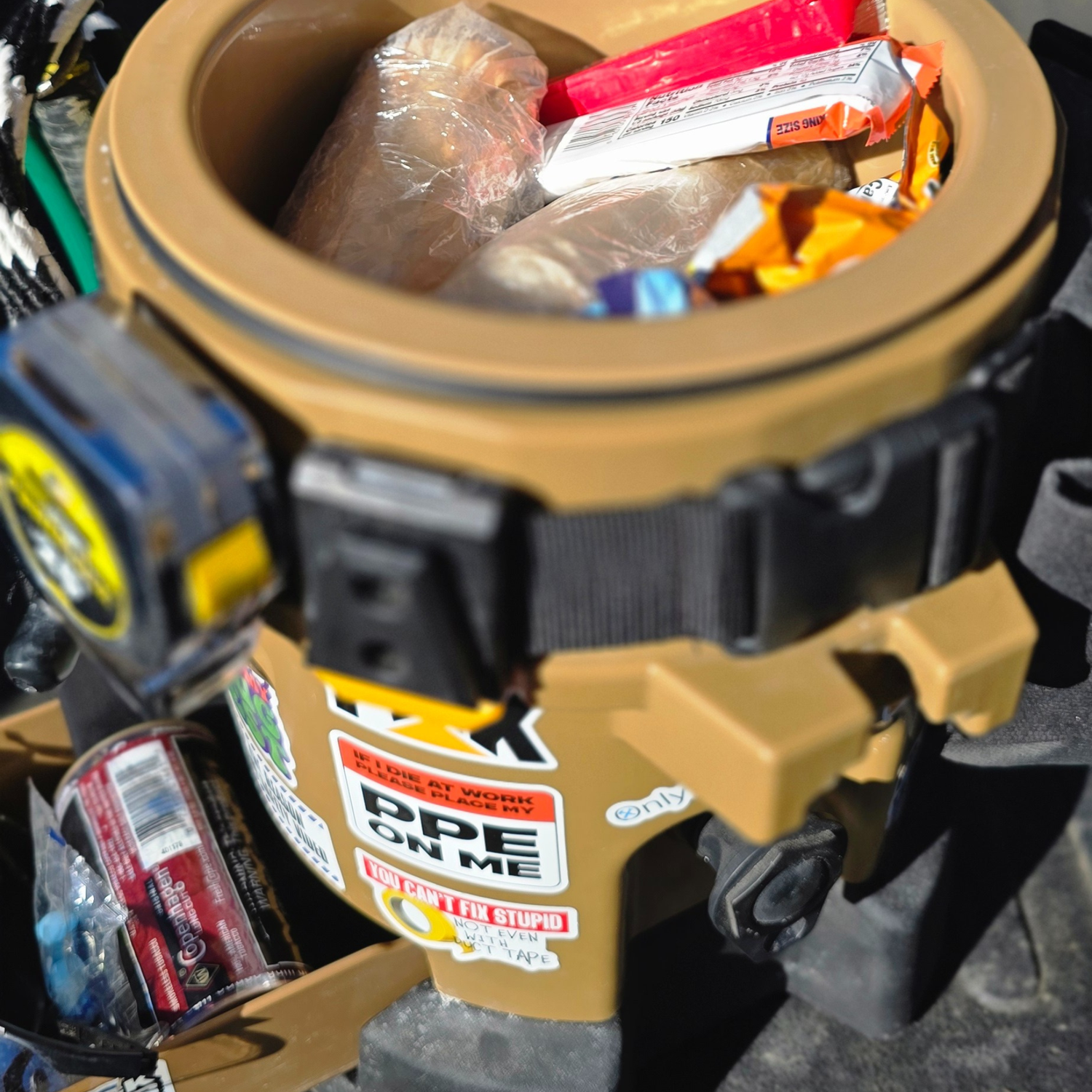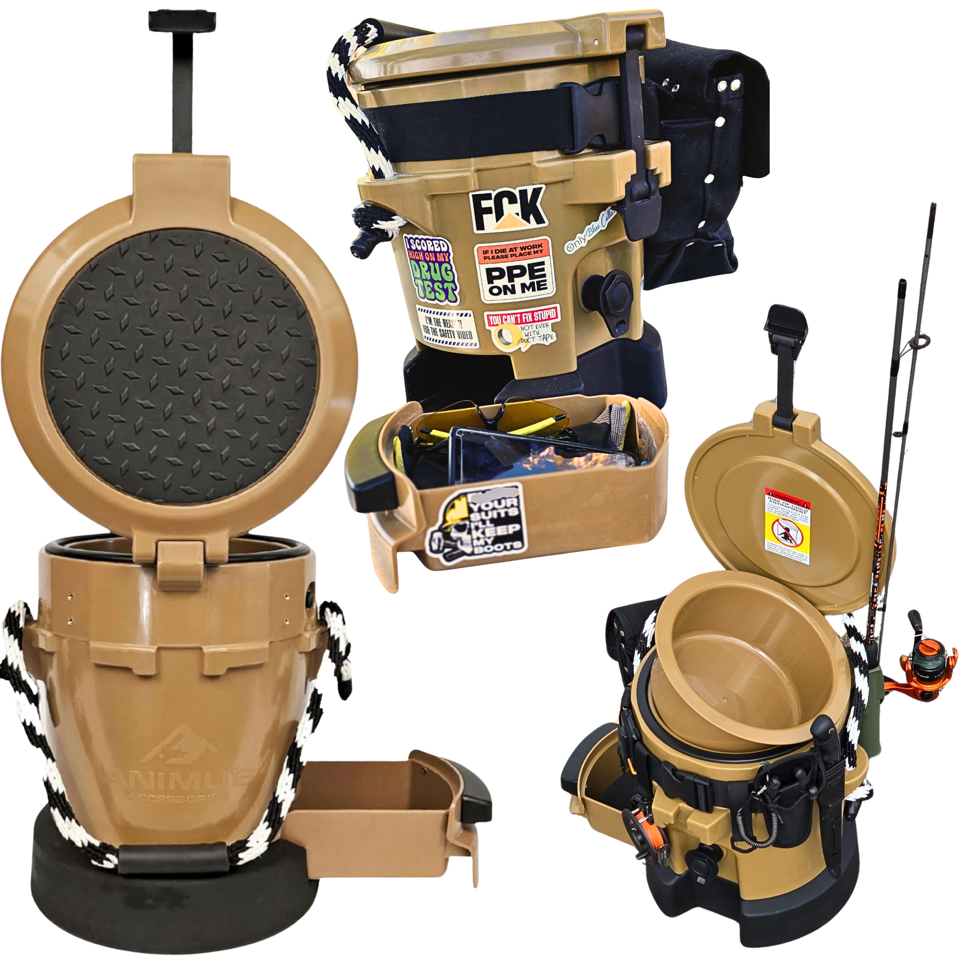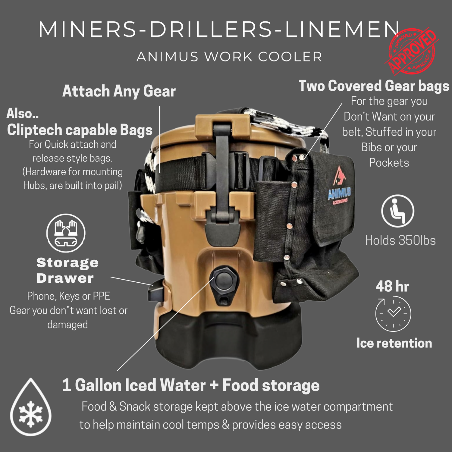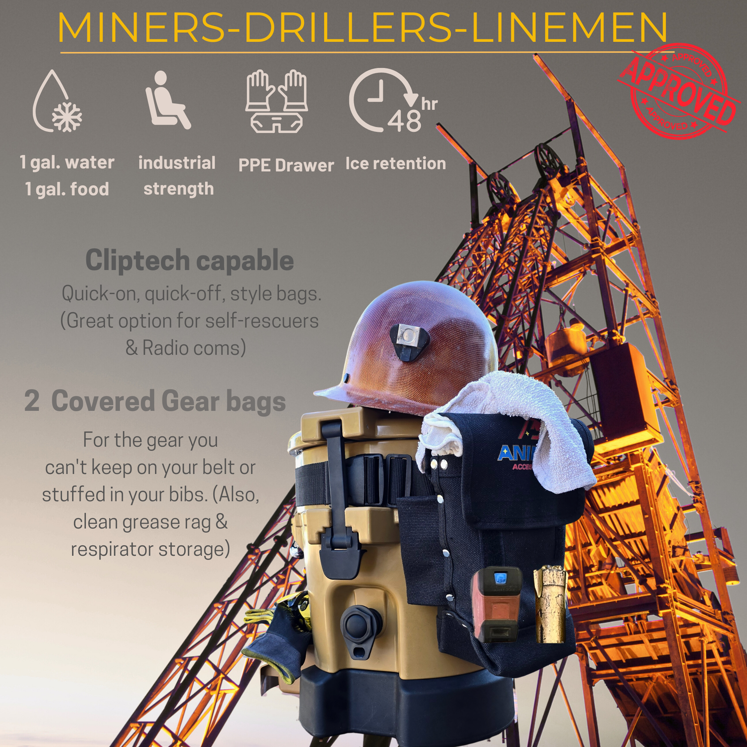 Engineered as the first of its kind by minds of underground miners and drillers known as the "1st- 5 in 1 Work cooler and Gear Hub"