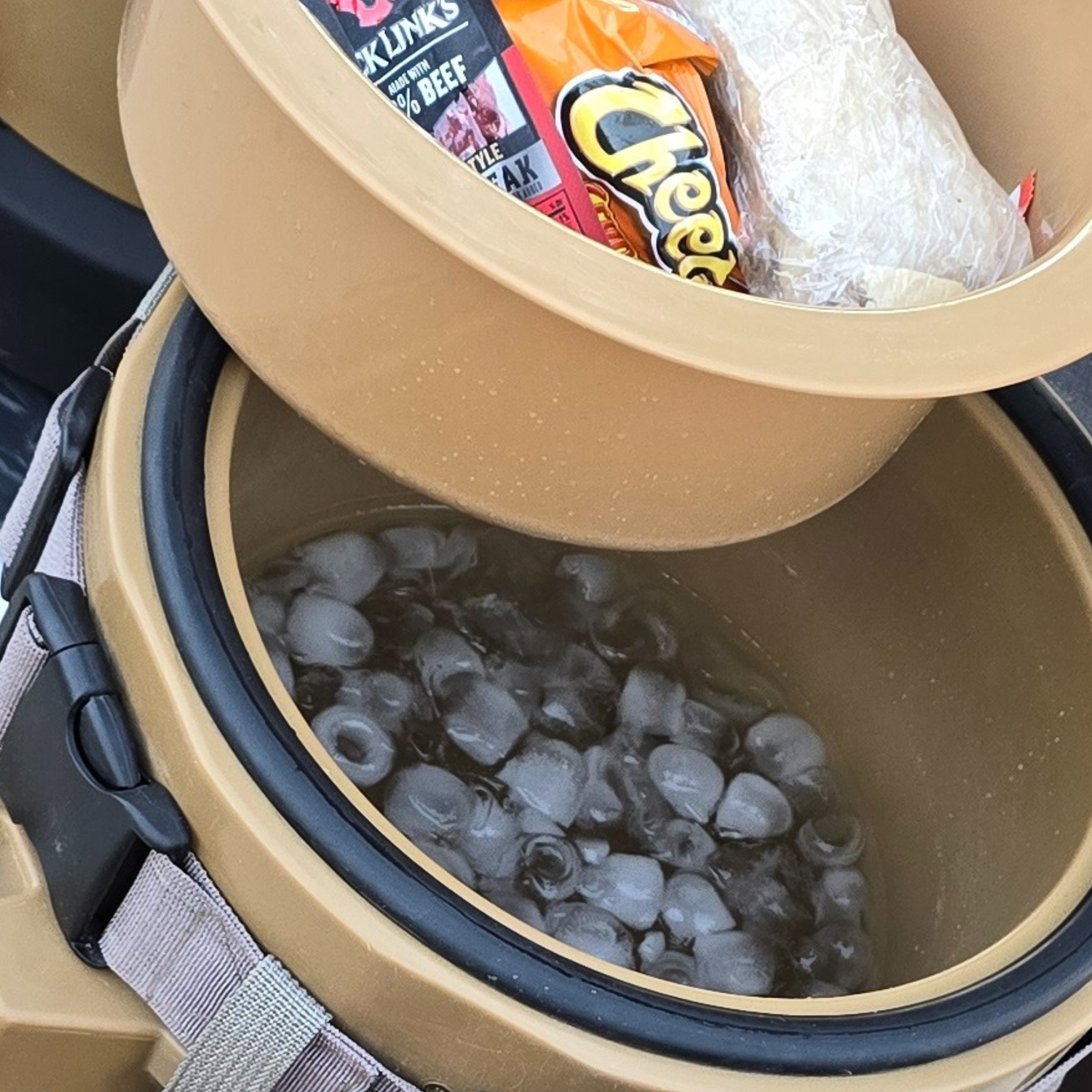 Dual inner cooler Storage: 1 gallon Food storage tray held above 1 gallon Ice-Water storage to help maintain cool temps.